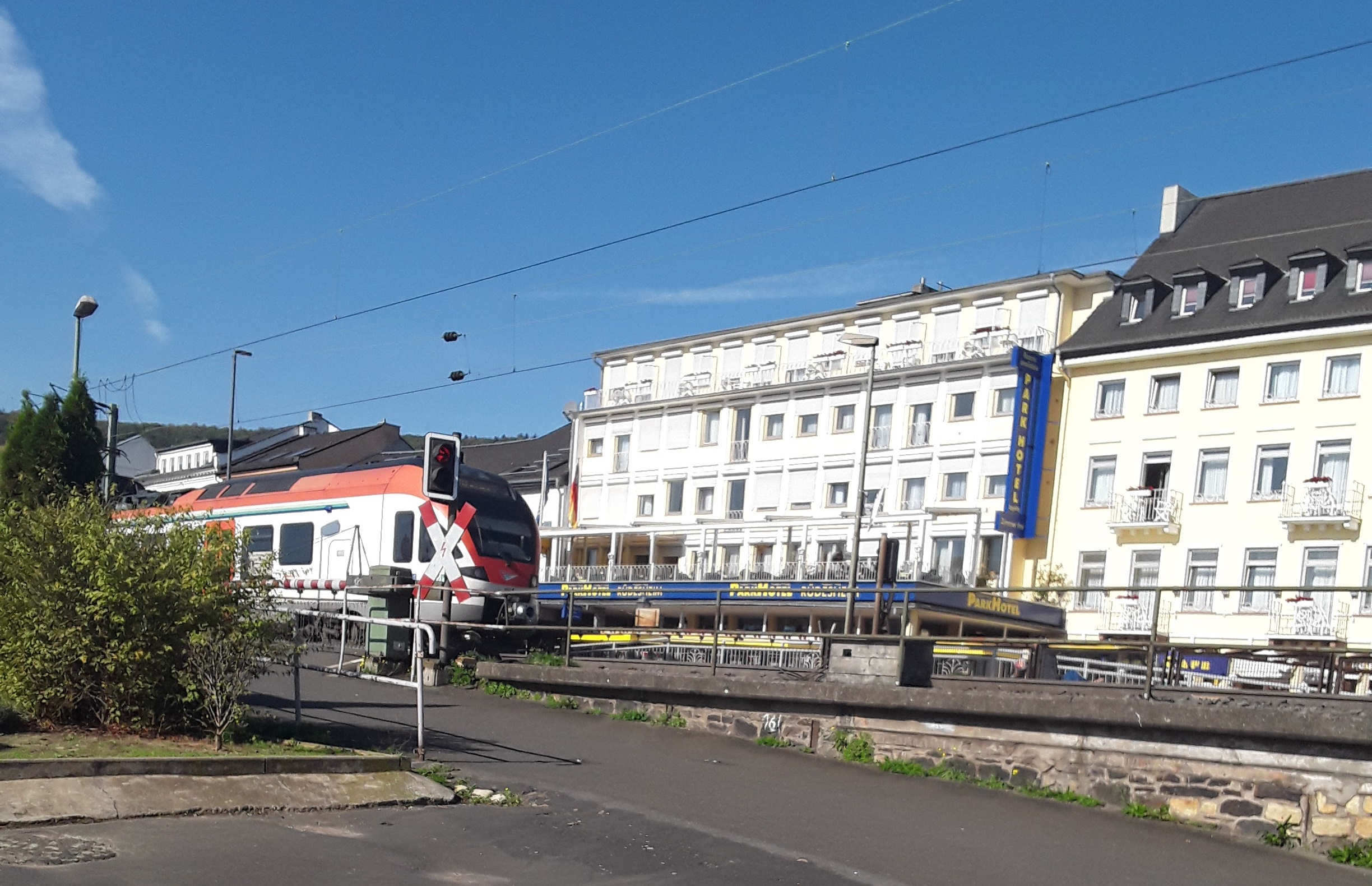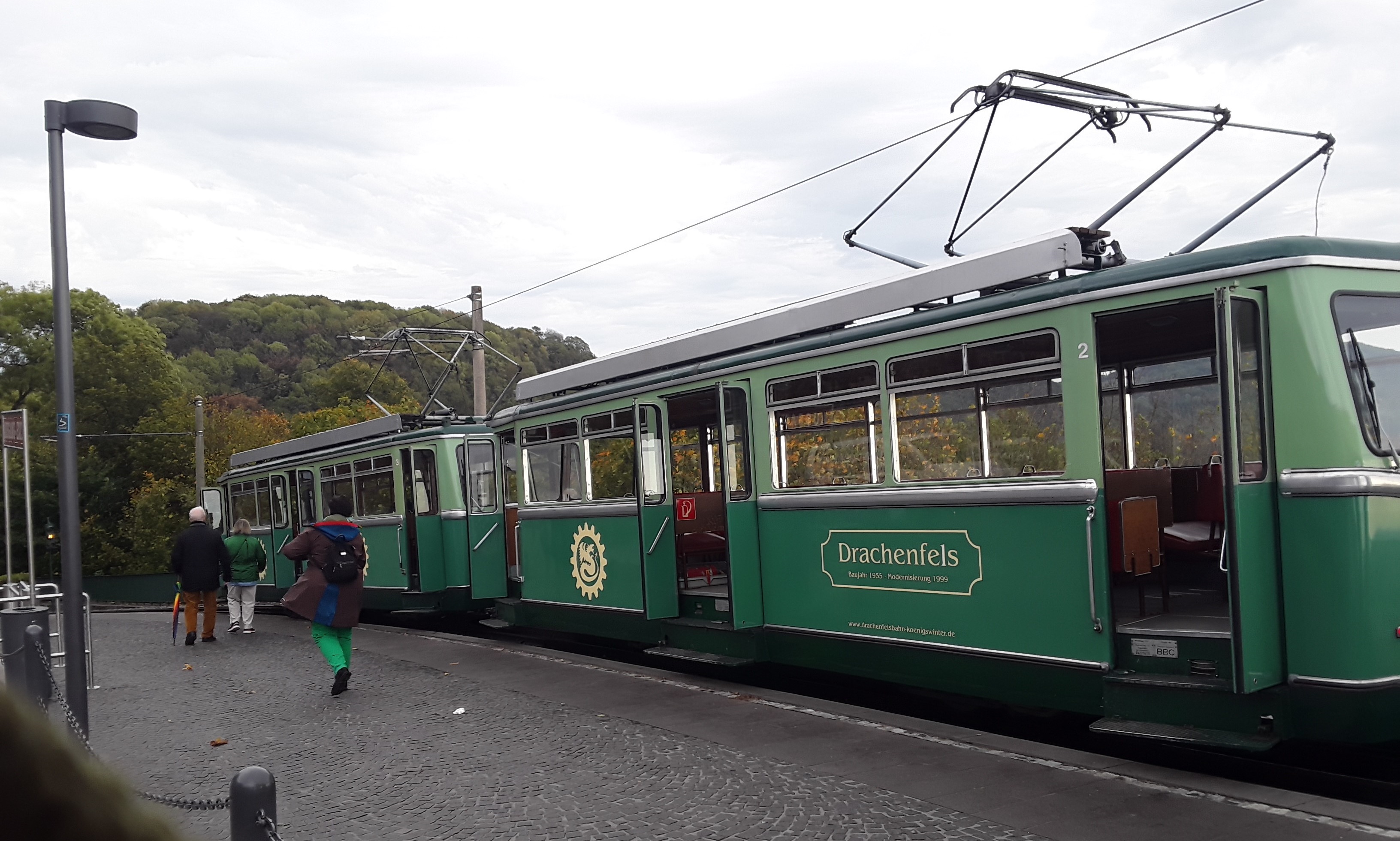 Overcast but turned sunny. Decided not to take part in group visit to Remagen Peace Museum as it is temporarily housed away from its historic site. Took train from Remagen to Cologne changing there for train down east bank of The Rhine to Konigswinter for trip on Drachenfels Rack railway. Having returned to Konigswinter I carried on down to Koblenz for train back up west bank to Remagen. Then took a stroll down to river promenade.