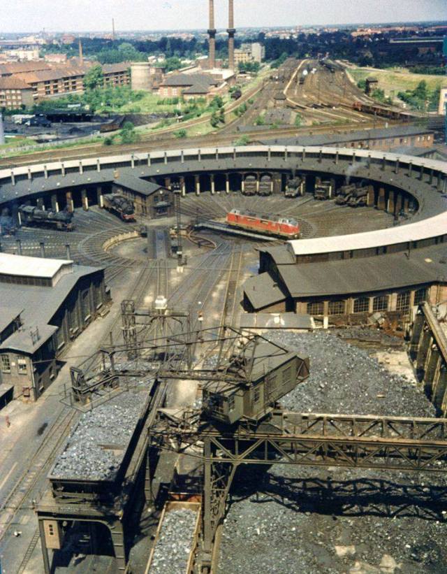 From Facebook, a mega-roundhouse in Altona, Hamburg. This would make quite some model – even the coaling facilities are on the grand scale….