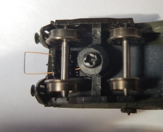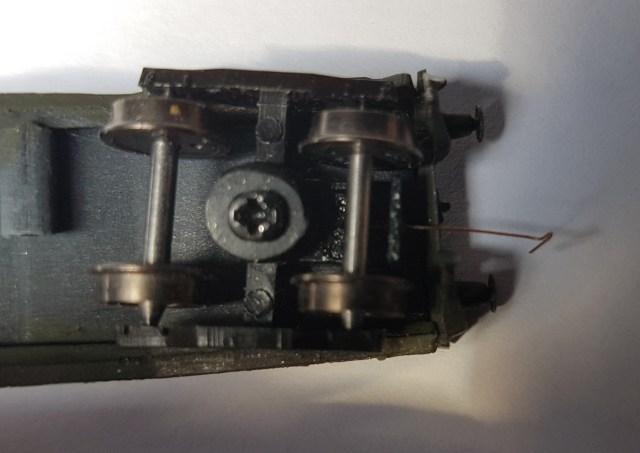 Next, the fixing pin for the bogies is almost impossible to glue into place without seizing up the bogie pivot. This was solved by cutting the top off the pivot and using it as washer, with a small screw retaining the bogie. One solution, I guess!