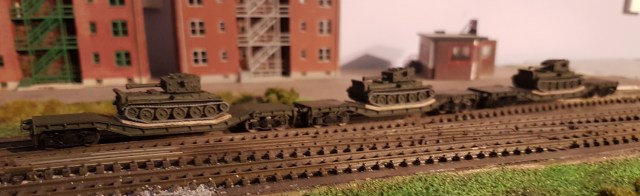 Some real progress with the Warwells, at last. Here are the first three, rolling and coupled, loaded with Cromwell tanks.