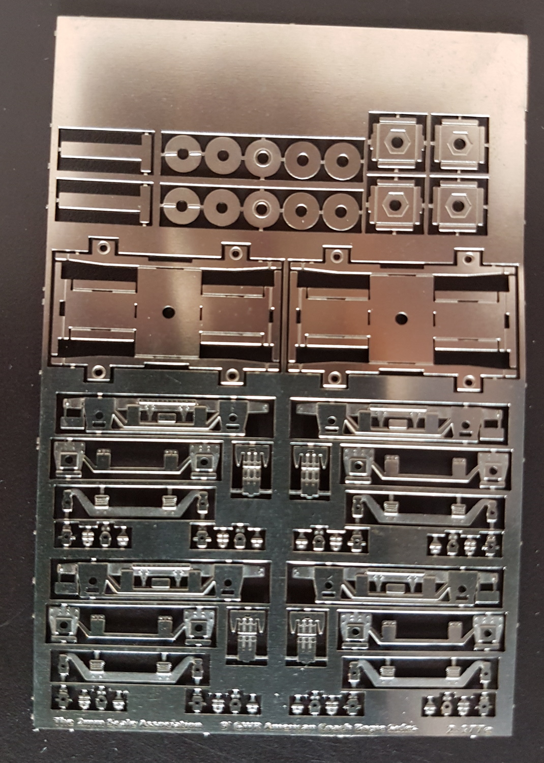 The camera is, of course, cruel, and especially shows where I’ve creased the tumblehome in the thin brass. But it was fun to build and good soldering practice. The bogies provided were terrible, so I’ve invested in these very nice etched ones. All on nickel-silver – that is easier to solder as it conducts less heat. All those layers of detail will be a challenge, and some will probably go on with superglue.