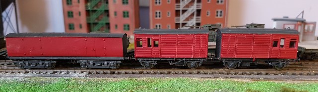 All the vehicles need numbering and lettering – simple enough if tiny for BR. I must order some Fox transfers, I guess. And they need couplings. I seriously considered fitting these vehicles with DG or B&B couplings, but having tried making them, it was too much like hard work. I can solder up a 2mm chassis, but those little couplings defeated me. I reluctantly decided to stick with the standard ‘N’ Arnold style coupling. Dapol knuckles look a little better, but are very expensive. The horse boxes can easily have couplings fitted, using those in the kits or Dapol conversion kits. The Gresley’s have NEM pockets. I thought that the bogies for the bullion van could prove difficult, but it turns out that the NGS coupling pockets – rejected as useless for my Warwells – will work very well here. Moral of the story, never throw anything away.