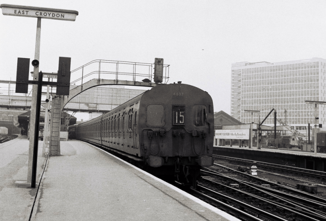 A 4-SUB unit at East Croydon station. Note the Southern concrete signal gantry. Looks a bit different now….