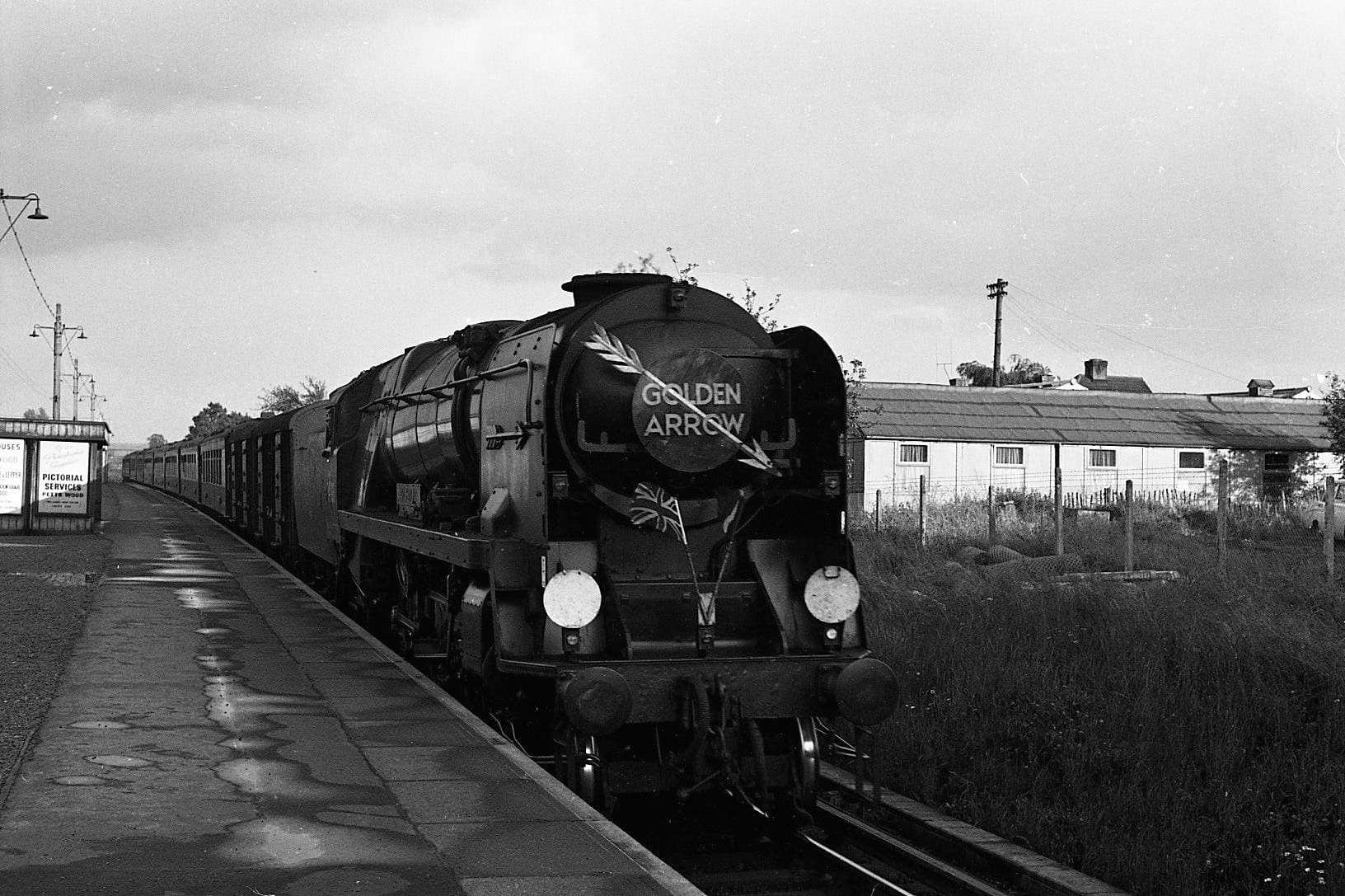 I was brought up in Petts Wood, and this scene is very familiar. I remember seeing the Golden Arrow, stream hauled, passing as I went back to infants school after lunch. And early train spotting days caught it with a class 71 electric on the front. We’re looking south in this photograph, with the old British Legion Club building on the right. All long gone, though the garage behind it is still there.