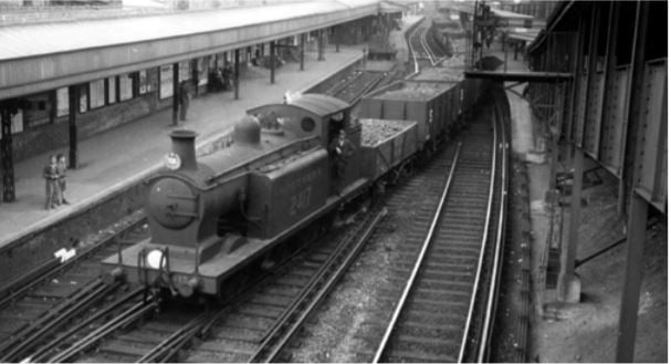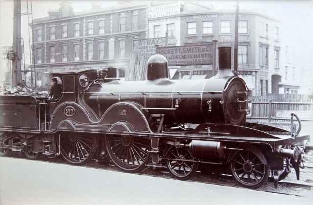 An ex-LBSCR C2x shunting at Bromley north in BR days. One of the few British locomotives to have two domes – hiding Billington’s top feed apparatus. To my eye, the single domed version looks far better….
