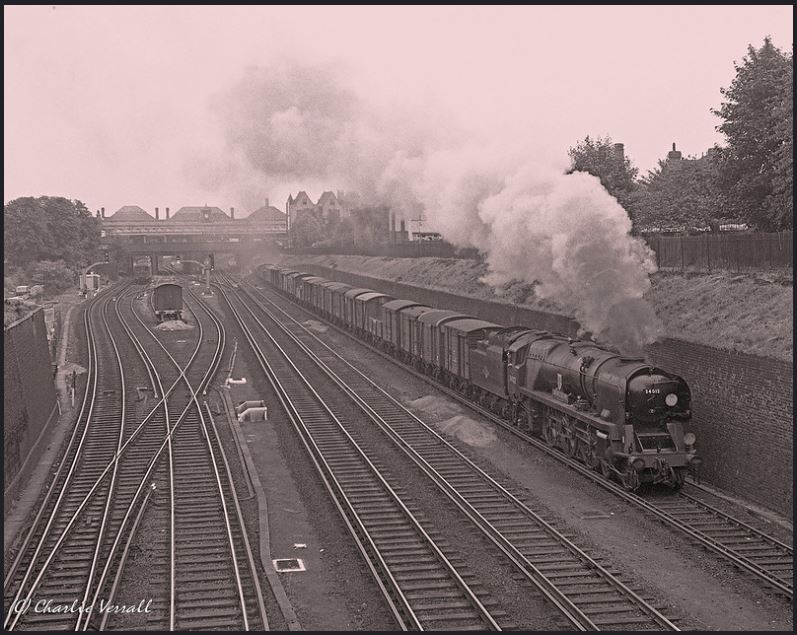 In later days, the rare sight of a rebuilt Bullied Pacific on a van train at East Croydon. (Photo by Charlie Verral) There was an interesting track layout to these approach roads.