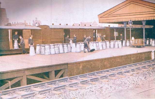 And this coloured picture is of Vauxhall, unloading milk churns onto the platform. In later days, milk tank wagons unloaded into a piped system, that was then pumped across to the milk bottling plant. For the rest of the day, the platform was host to a string of suburban trains, next stop Waterloo. The ‘Elephant and Castle’ pub, seen over the first van, existed until the late 1990’s, when it became a Starbucks.