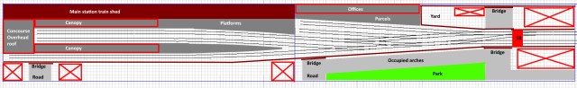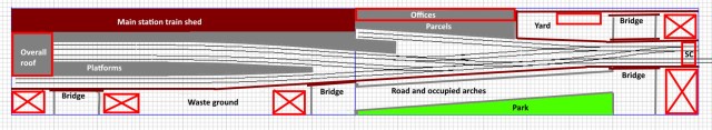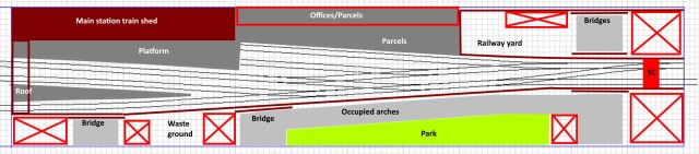 I still wondered about this design. Really, I find the left hand board just uninteresting! As I commented in yesterday’s post, it is difficult to make a busy urban platform interesting. The lack of movement is not helpful. The actual concourse has some interesting features, but long empty platforms are a bit boring. And that length of waste ground is still rather uninteresting. Some under arch industry would be OK, but again not really appropriate under a London terminus. It would be better to have another length of road here, but I then lose the two buildings at either end of the board.