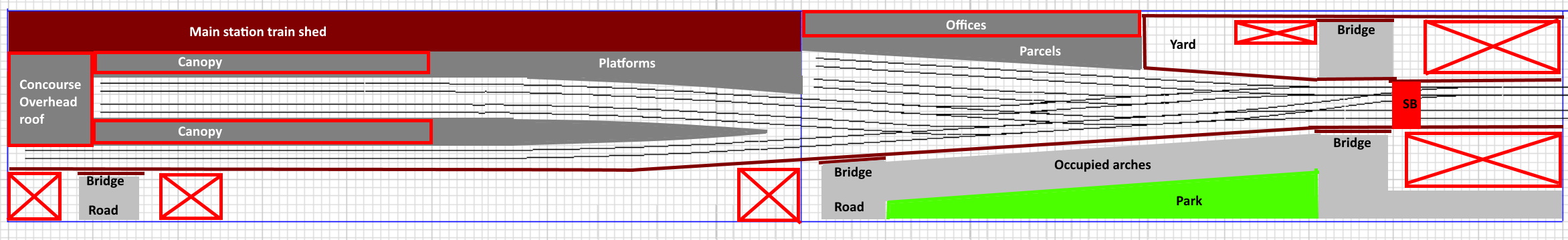 I still wondered about this design. Really, I find the left hand board just uninteresting! As I commented in yesterday’s post, it is difficult to make a busy urban platform interesting. The lack of movement is not helpful. The actual concourse has some interesting features, but long empty platforms are a bit boring. And that length of waste ground is still rather uninteresting. Some under arch industry would be OK, but again not really appropriate under a London terminus. It would be better to have another length of road here, but I then lose the two buildings at either end of the board.