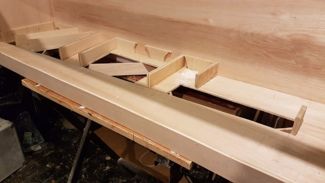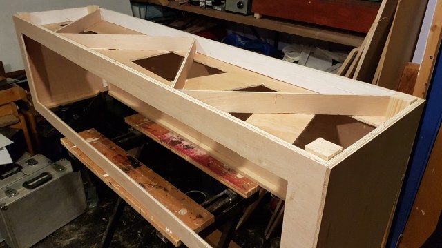 I slowly and carefully glued and pinned (in places) the bits together to build the shadow box of the main board. Stiffening was added to the underside, using a diagonal pattern rather than the more usual cross-pieces. This should be more rigid, and is made easier – and indeed possible – as I haven’t got to dodge the point motors under the board.