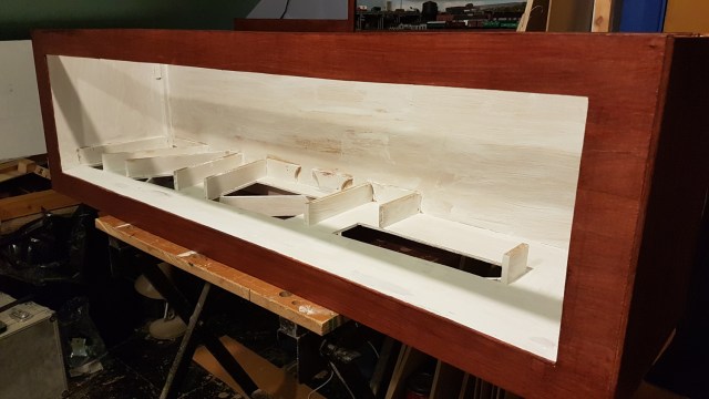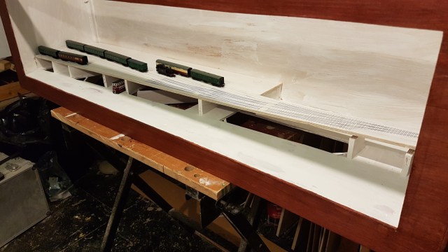 Having placed, but not fixed, the upper board in place, I fished a few trains out of their blue plastic boxes to get an idea of what the finished article might look like.