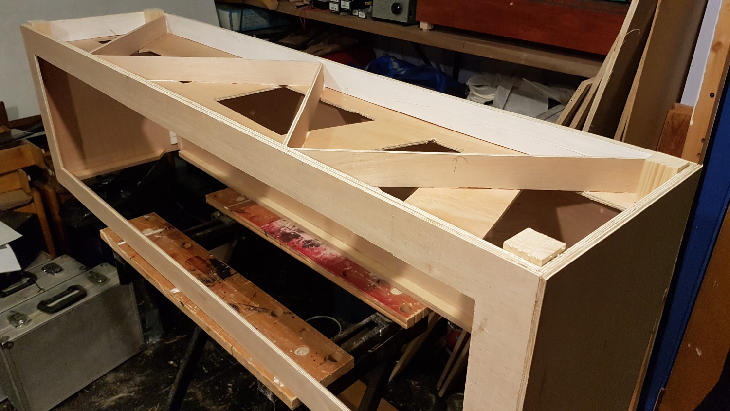 And with a coat of primer inside (pretty rough, but it will be covered in due course) and varnish outside. Just a tin of dark mahogany varnish that was lying around, but it brings up the plywood nicely.