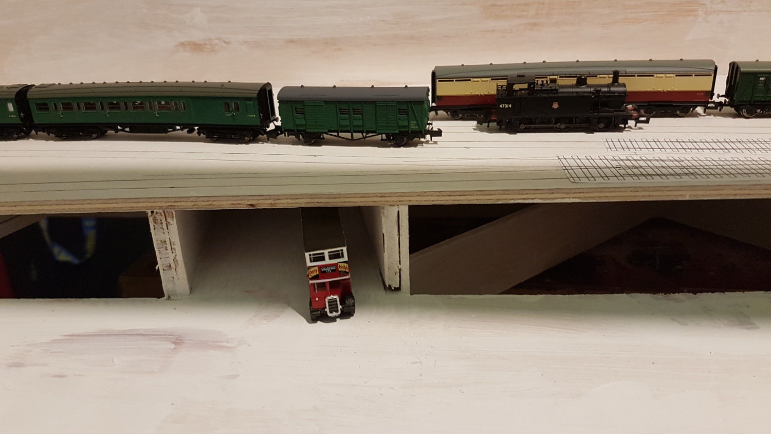 Setting this up has brought up a few thoughts and problems. Once again I muttered about the silly idea of putting the station on a raised section. It occurred to me that I need to get some scenery on those roads under the station before I fix the top board down. So there will be a little pause whilst I work out how to do the road and bridges for this section. And I suppose those long road ‘tunnels’ ought to have lights, too.