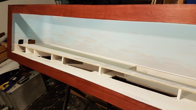 Cut the holes in the end of the shadowbox for the tracks to enter/exit. I can think about building the other boards now, I guess. I also need to think about legs or trestles for the layout, but that might have to wait for covid to subside, and an ‘essential’ visit to the woodyard. I’ve also added the skypaper backscene. There are a couple of poor joints to this, but they are on the ends of the layout, so won’t show much, if at all.