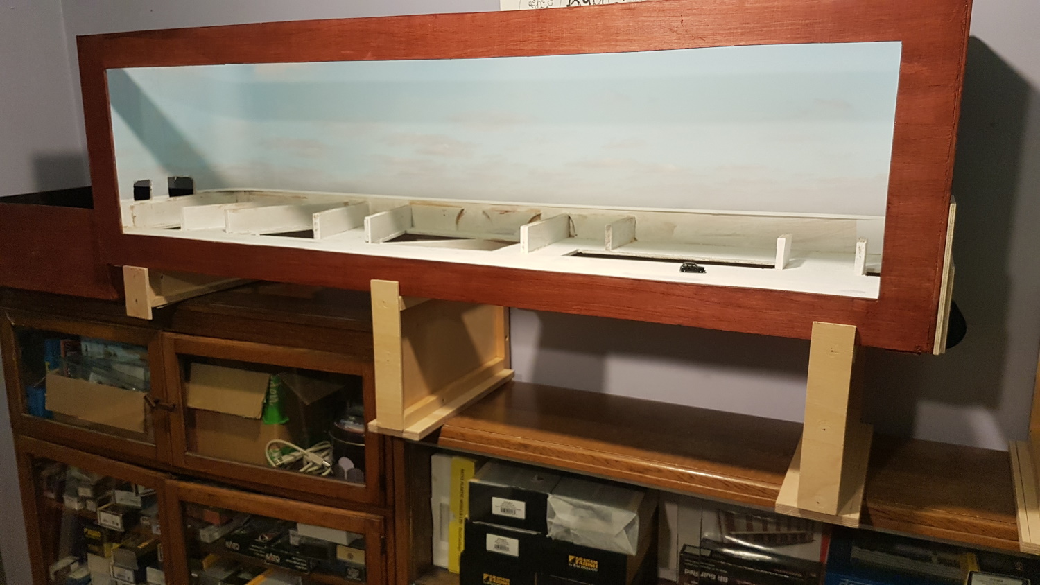 I built the simple box that will represent the concourse end of the platforms. Easy to uncouple a locomotive, too, if it’s not under an overall roof. The boards are aligned with pattern-makers dowels. I was expecting to make a mess of these, and was pleasantly surprised how easy it was to get correct alignment. (Well, within 0.5mm, that can be easily packed up under the track over the joint. I still have to fit the latches to hold the boards together.