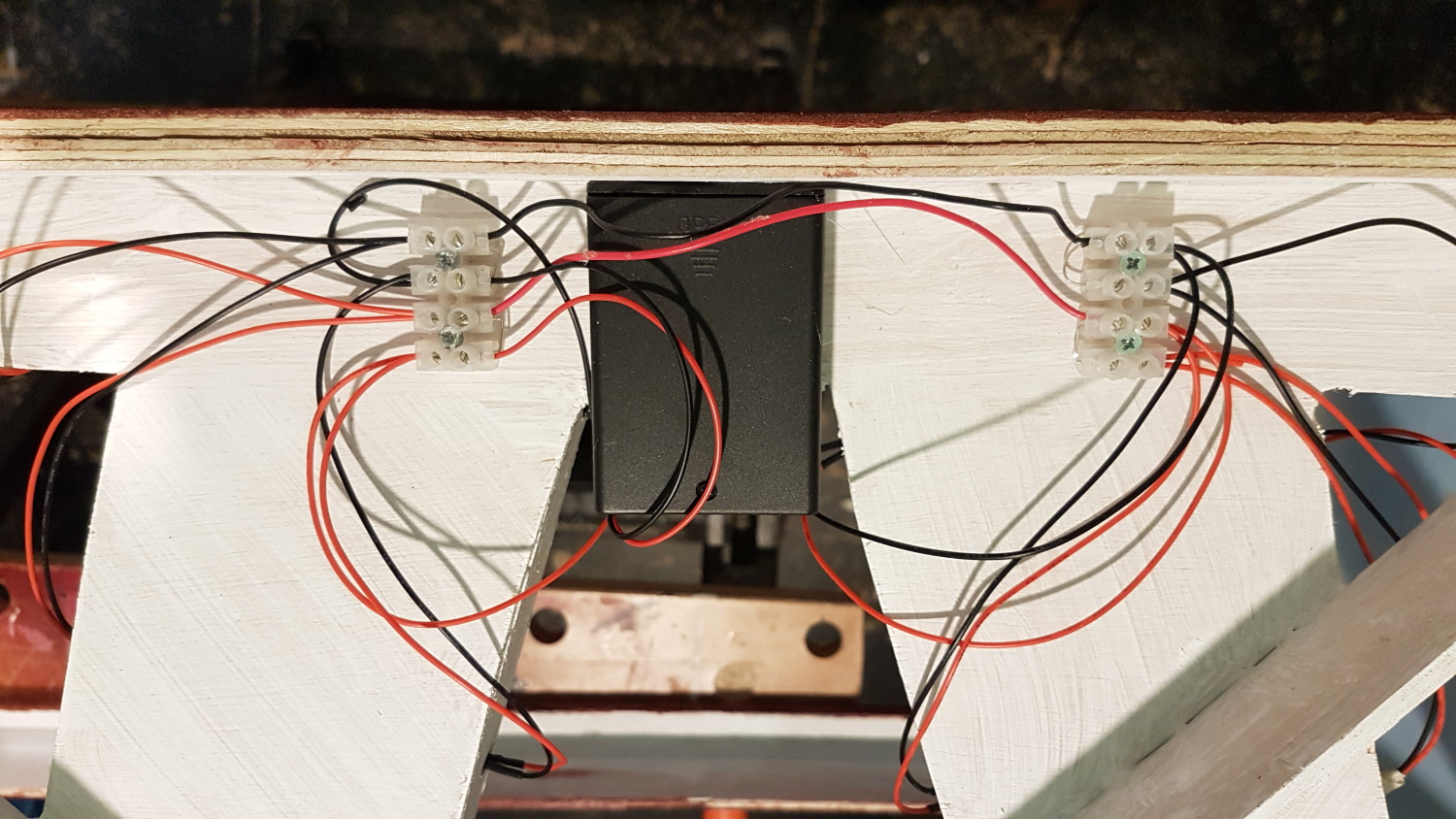 I then wired up all the LED street lamps for the tunnels. Although nominally 12V (with resistors fitted), I tried connecting all eight of them to a simple 4.5V battery pack. This seems to work fine, and I hope that the LEDs will last longer than the railway!
