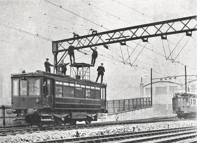 Next, the LBSCR overhead electrics. Entering Peckham Rye station, and below, the petrol driven maintenance vehicle checking the overhead, with the Peckham car sheds just behind. The Brighton overhead was scrapped and the cheaper LSWR third rail used in preference. In hindsight, maybe not the best move. One can still see the foundations for the overhead at locations around south London. And the Brighton EMUs were converted to third rail, keeping the distinctive low roofs where the pantograph was installed. Just like modern units, when set up for third rail, not overhead. A final haunt of these venerable units was the single track link past Waddon and Beddington.