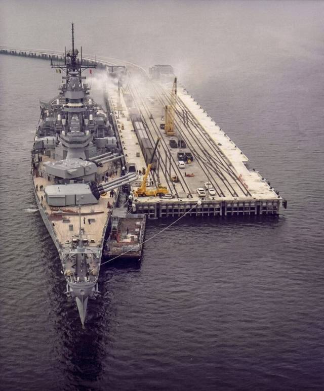 USS Wisconsin (BB-64) on-loading ammunition at Pier 4 in Naval Weapons Station Earle, NJ, March 1990.