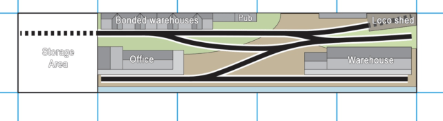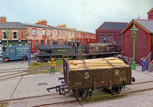 The first two come from this month’s edition of British Railway Modelling. Both are in 4mm scale, and both are just 5′ long (say 3′ in N.) Some of you have probably seen Graham Muspratt’s ‘Canute Road Quay’ on the exhibition circuit. Loosely based on the dock lines on the Southern Railway, it is ‘typical’ enough to accept sets of rolling stock from all over the Southern, and could also represent other parts of the country.