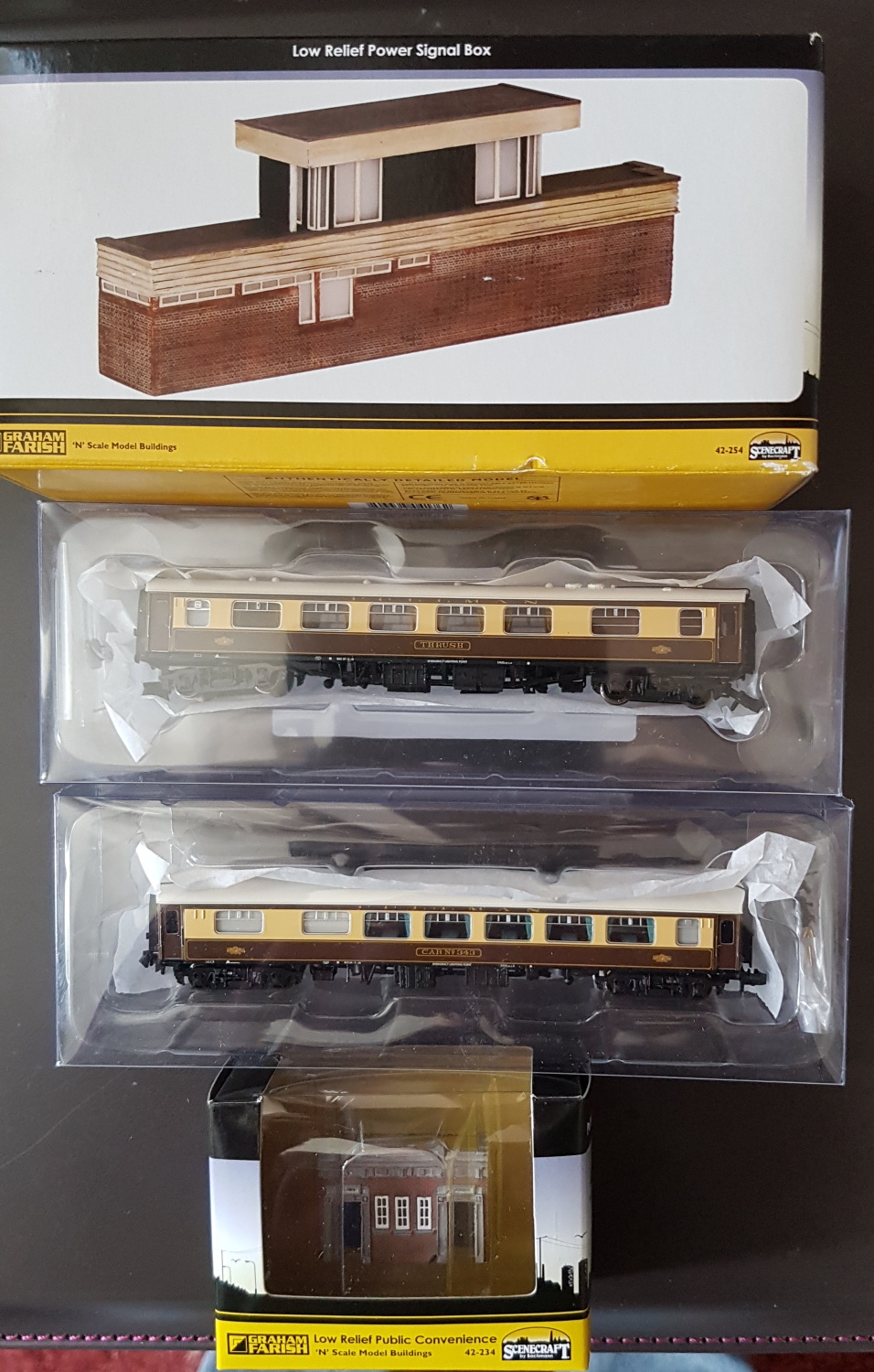 Another parcel arrived today, from TMC with a number of half-price items. A pair of Farish Pullmans from a trainset have different names from the four that I have had for years, so will extend the rake a little. And these low relief buildings may well find a home on the layout (especially the public conveniences!)