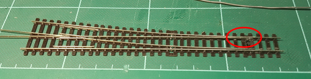 I then added the wiring between point blade and stock rail. No problem here, and I’m pleased to note that the plastic used for the base is much slower to melt than Peco sleepers. It may, of course be due to the use of Code 40 rail, with a lot less metal and less heat needed to solder.