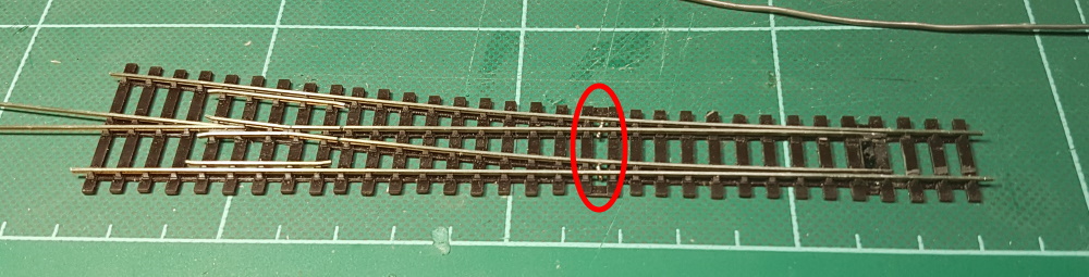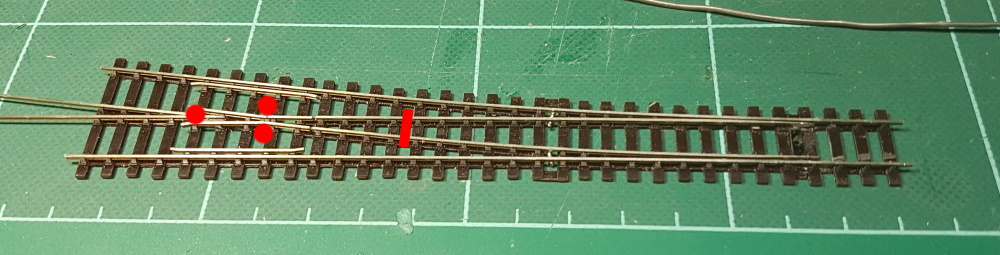 Secondly, a touch of solder at frog and knuckle at the three points shown below will strengthen the whole structure and give electrical continuity. I will try this out on the remains of my test point!