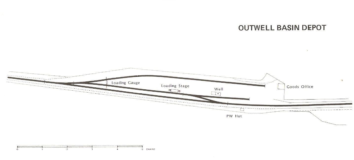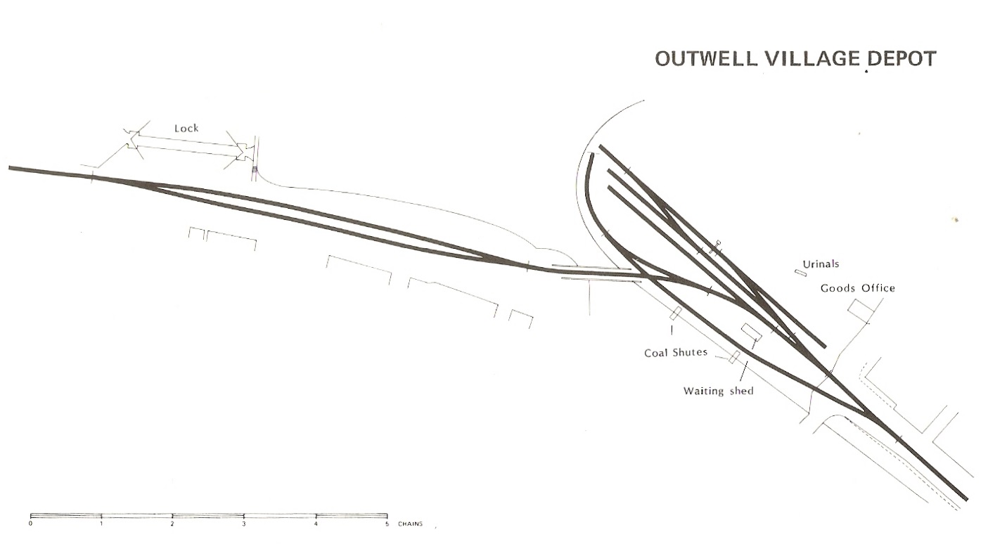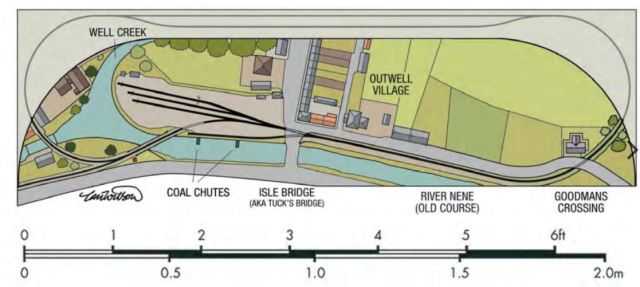 Further along the line we come to Outwell Basin Depot, the original terminus for the tramway. A very simple layout, but it could make a good model, as the old channel of the River Nene runs parallel (below) the line. The railway crosses the river just to the right of this diagram, on a bridge approached by a short 1 in 30 grade, that complicated prototype operations at times.