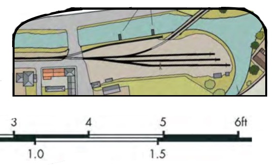 I then took this plan and cut it down to a more manageable 4′ x about 1′. Making rails and river disappear at each end would be scenically difficult, but there is a good, but not excessive, village area to model.