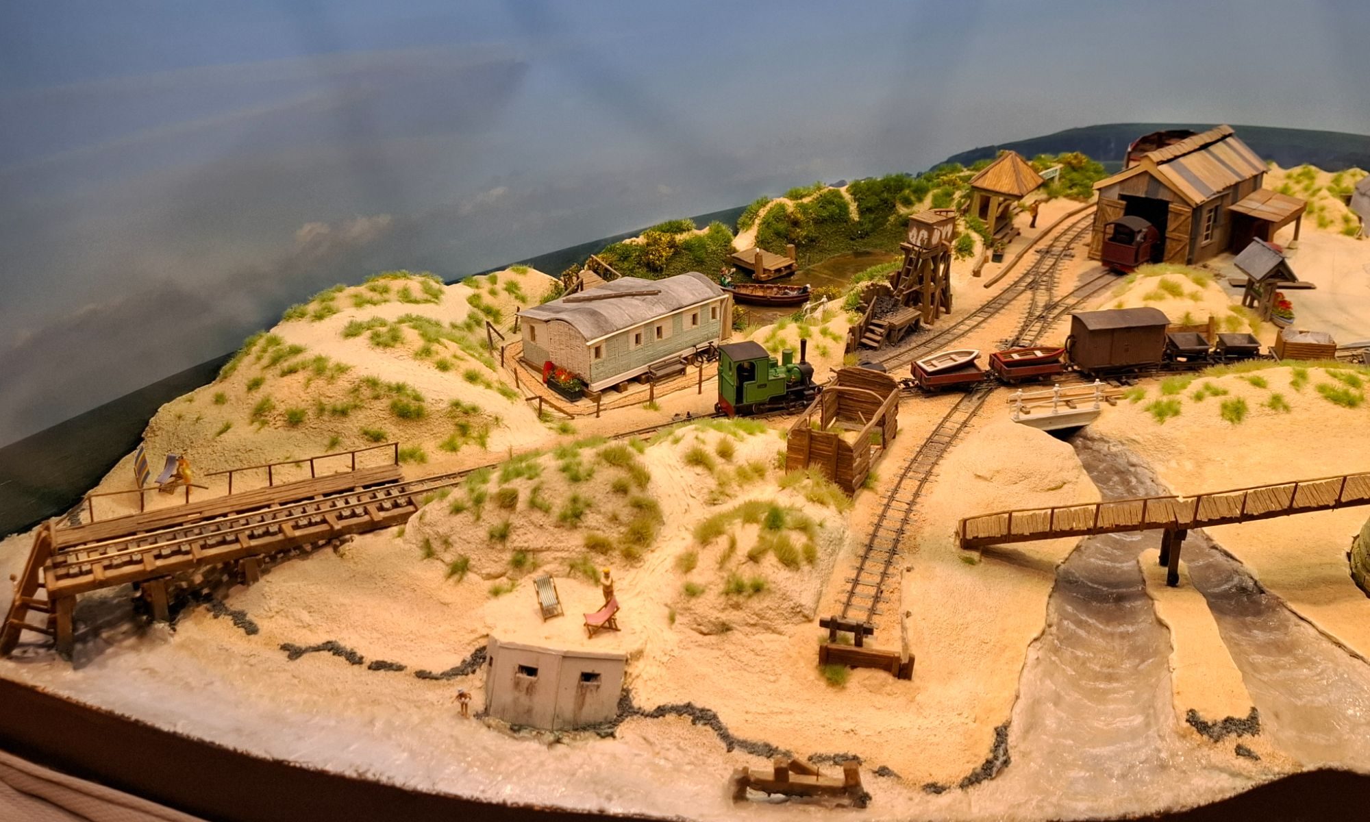 And now for something completely different! Sandy Shores Light Railway (OO9) is a flight of fancy set on the sand dunes of the South coast. A fascinating little line with a convoluted track plan – and some very well done coastal scenery. The operator told me that it’s rather interesting operating it!