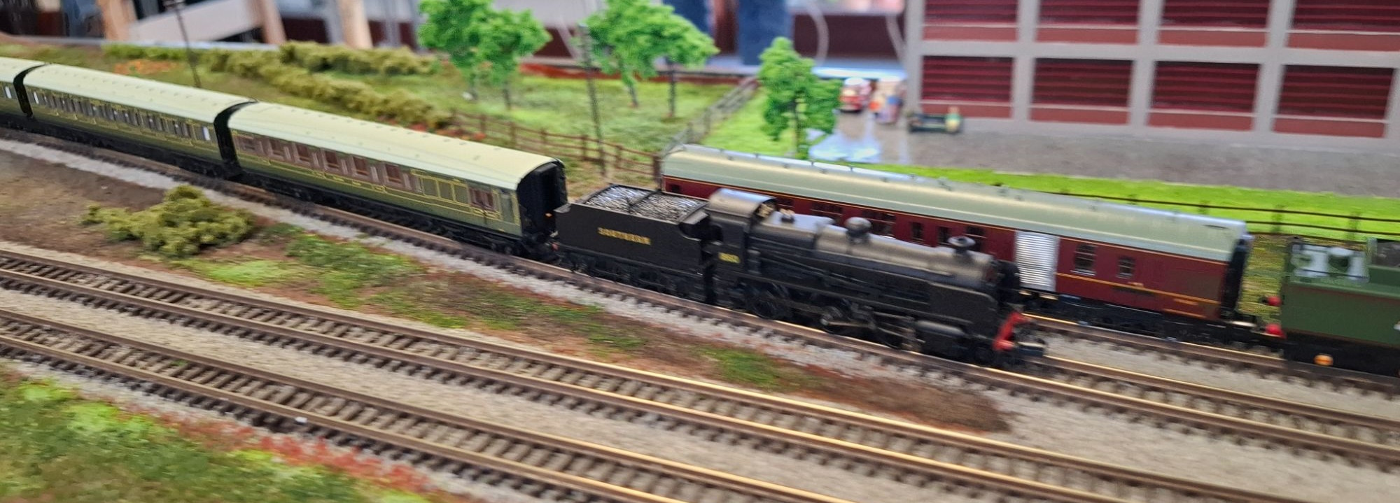 I ran a little Southern passenger train. The Farish N class is a model they got totally right – even the pony truck stays on the track. And the Dapol Maunsell coaches were a very cheap purchase in the sales as a four-pack.
