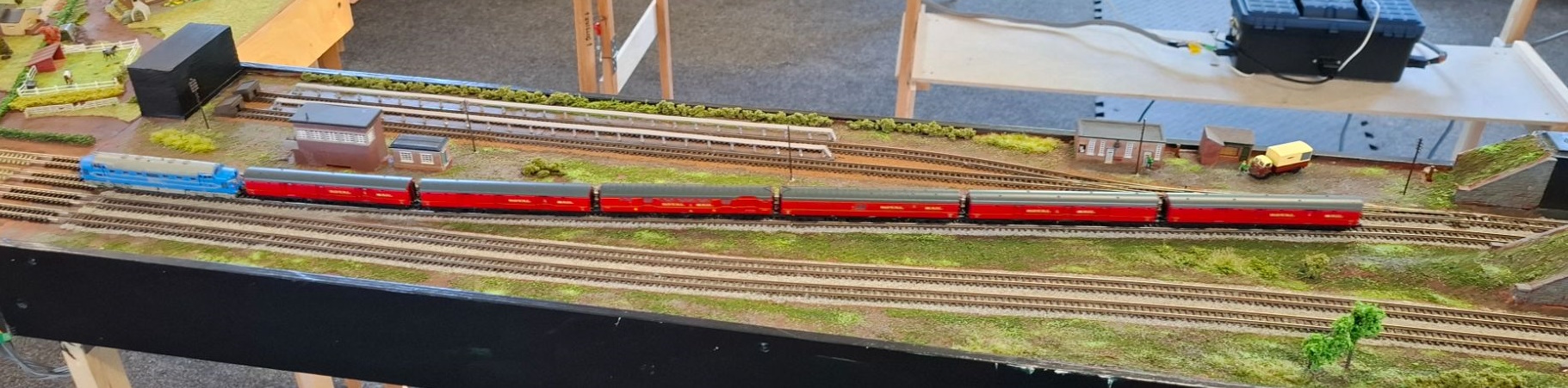 A warm sunny afternoon, and seven members had a relaxed afternoon running a few trains. So relaxed, in fact, that at least one of them had a short siesta….. But trains were also set up and set running….