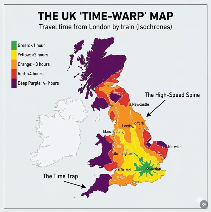 Travel time from London. There are some remote places in the UK! Note that it’s quicker to be able to get to York than deepest Norfolk – that’s just up the road. Mind you, I think that if we had ESNG members driving the trains, times would be halved….