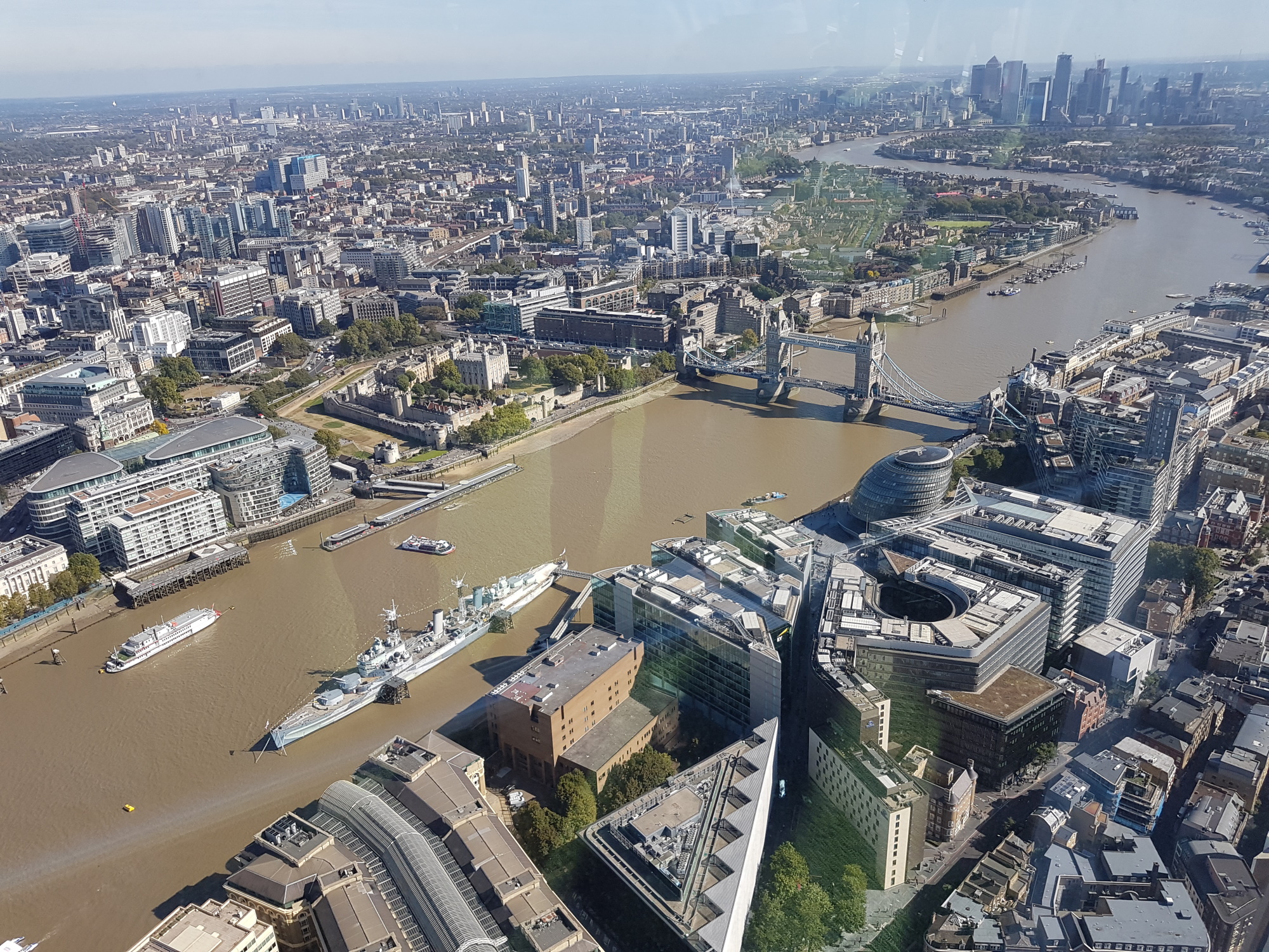The river has changed a lot from my pre-university days, when I was checking for empty buildings and zero water rate for the then Metropolitan Water Board. The Thames is still wonderful around London Bridge and Tower Bridge, but it is rather gentrified. Great views of the Tower of London and Tower Bridge and HMS Belfast, and it was just possible to see the Thames Barrier downstream, between two buildings in Docklands, and in the very far distance the towers of the QE2 Dartford bridge crossing.