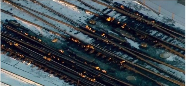 Flames from gas-fed heaters are melting away snow and ice at railway intersections in Chicago. It helps to keep the trains running with fewer delays. The US deadly cold snap has caused temperatures in the Illinois city to drop as low as -30C (-22F).