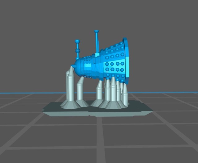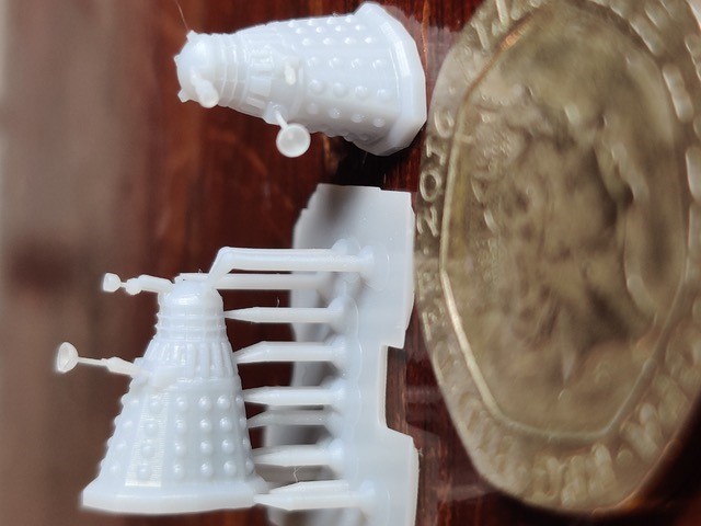 Problem is that most of the designs are in parts – usually top and bottom with separate sticking out bits. I find it hard to scale to N. Apparently, according to designs had from Google, Daleks are about 5’ 4” = 10.16mm in N Scale, but I can’t easily get a full height measurement of a completed design, as they are not scaled any way I can work out, given I can’t get into the main .stl files, but only what goes in to the slicer software.