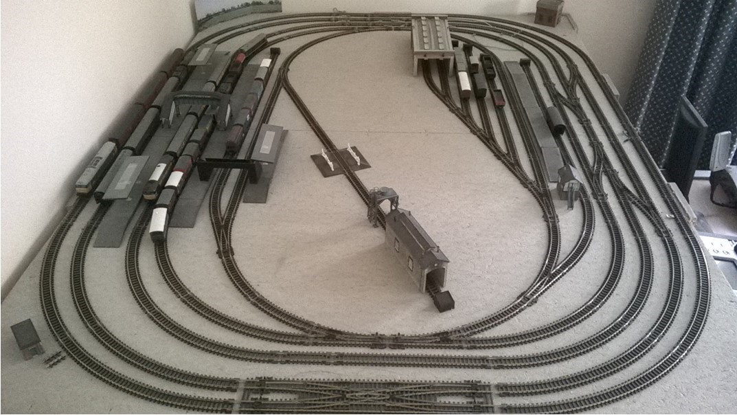 Here is a still of my current home layout. I make no excuses: it is as much track as I could fit on the ready-made 3 ft x 4 ft bare Sundeala baseboard bench. No scenery, apart from the purchased trackside buildings, etc. since I frequently dismantle and redesign it, so nothing is pinned down, either!